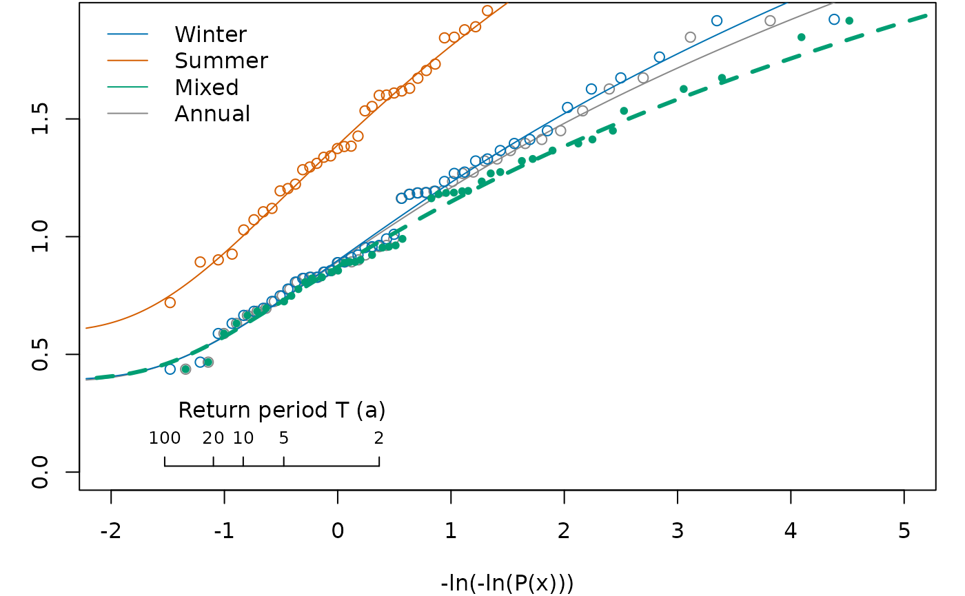 evplot(AM, xlab = "-ln(-ln(P(x)))", ylab = "Annual low flow (m³/s)", rp.axis = FALSE, type="n", plim=c(0.001, 0.5), ylim=c(min(AM)-((median(AM)-min(AM))/2),median(AM)))